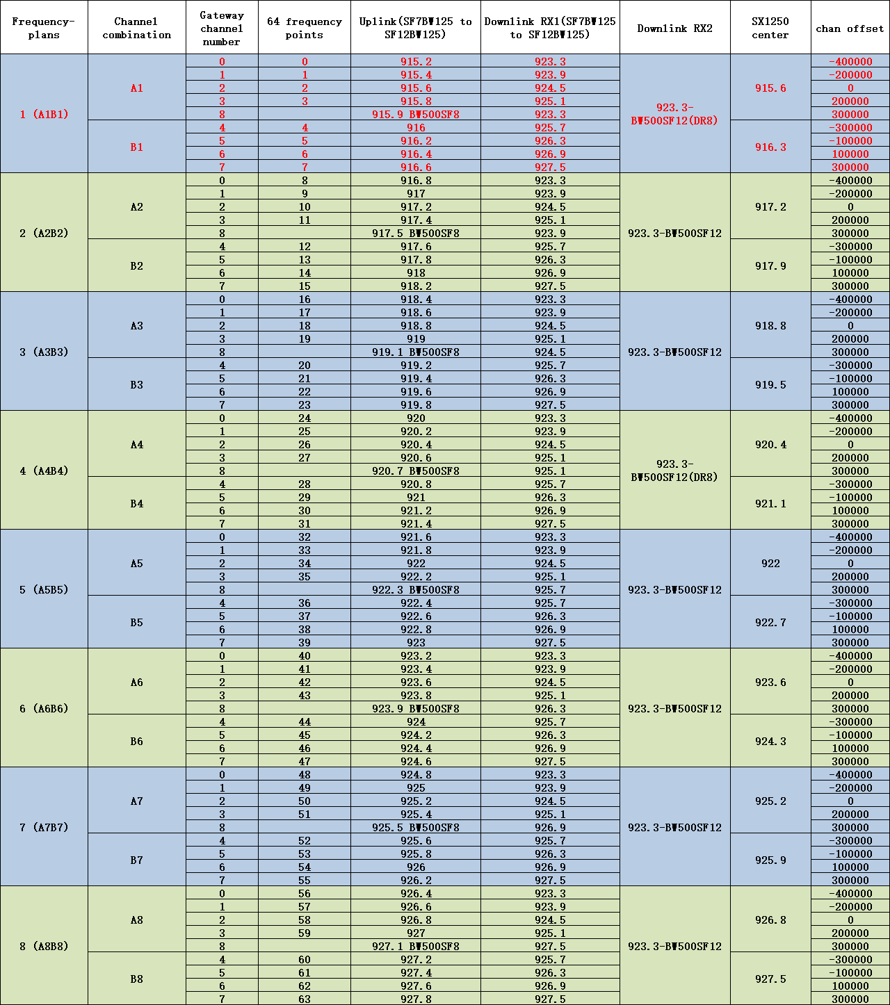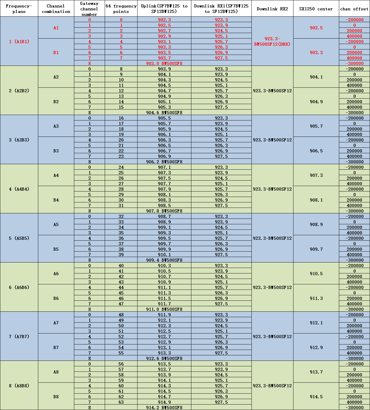 US902-928 gateway uplink/downlink channel table — factory default: A1B1