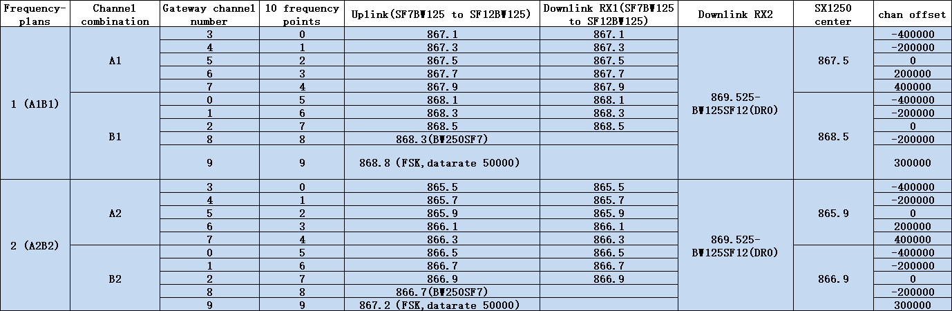 RU864-870 Gateway Uplink/Downlink Channel Table