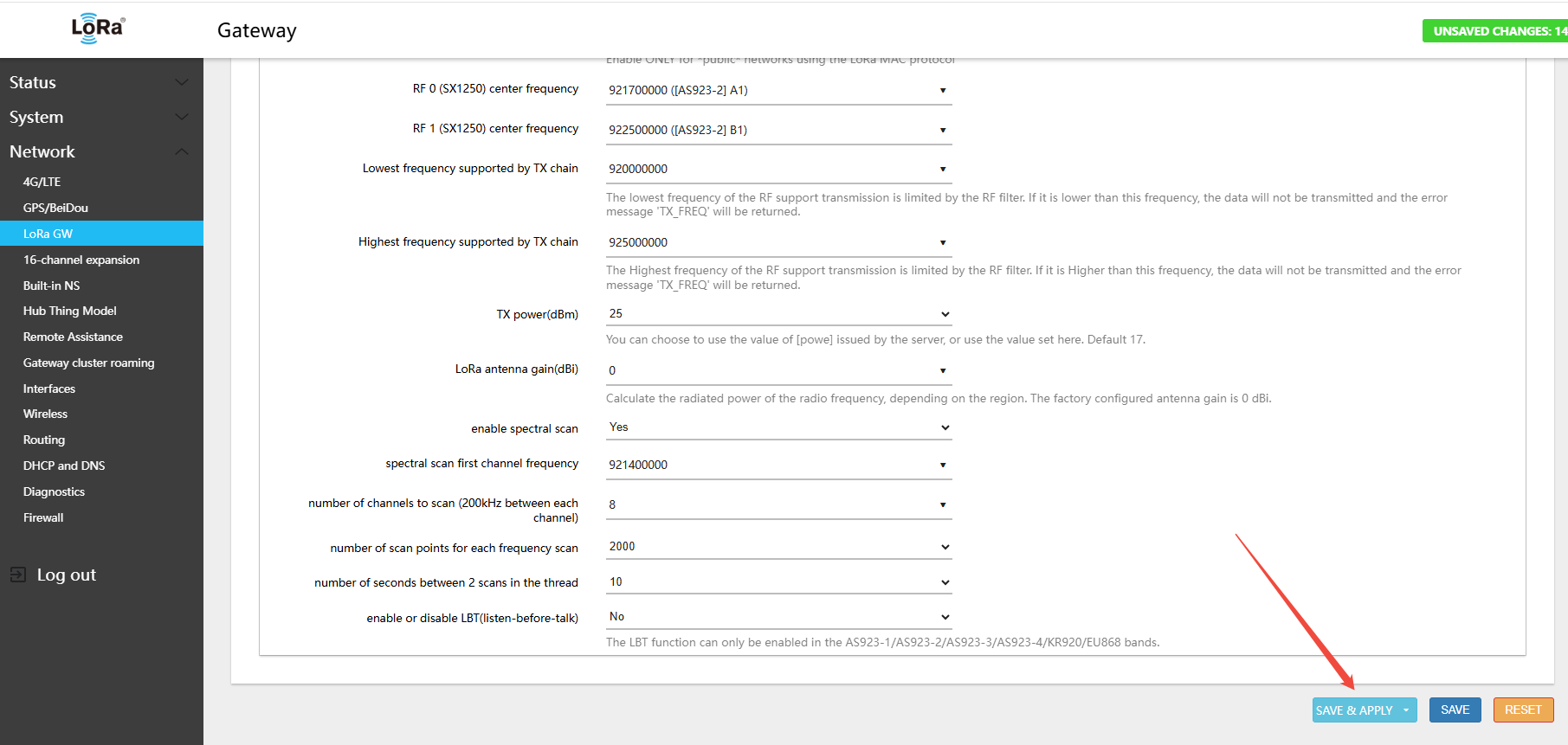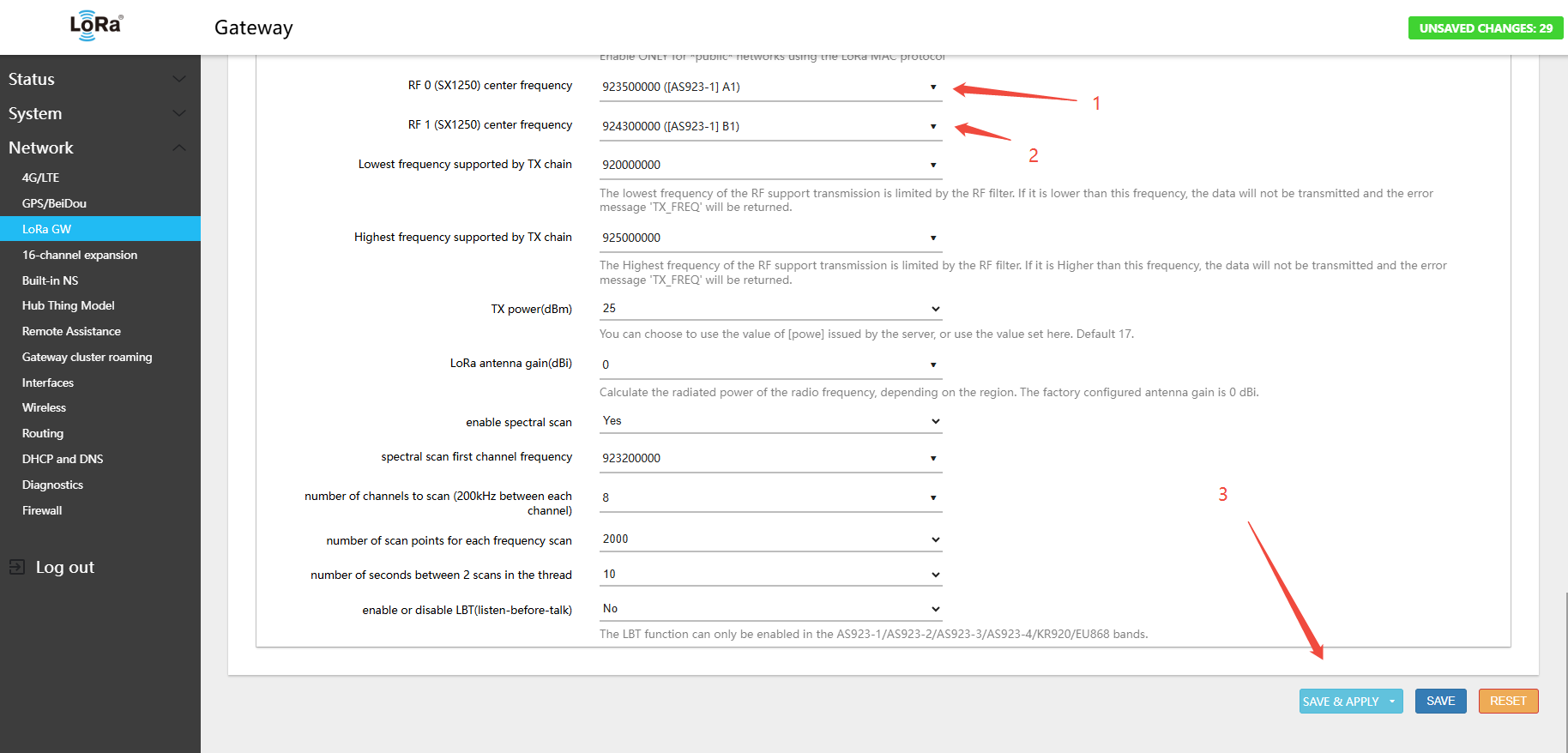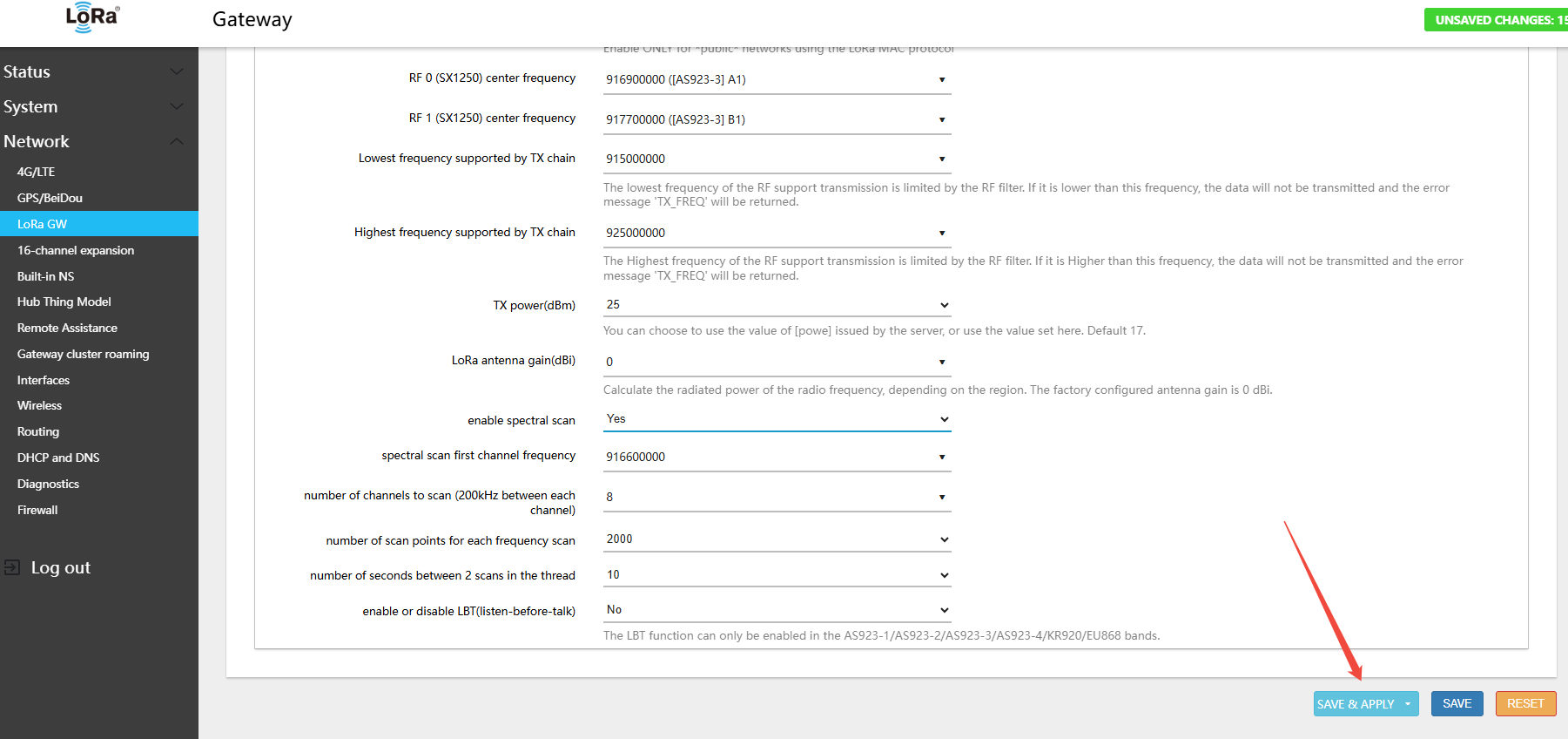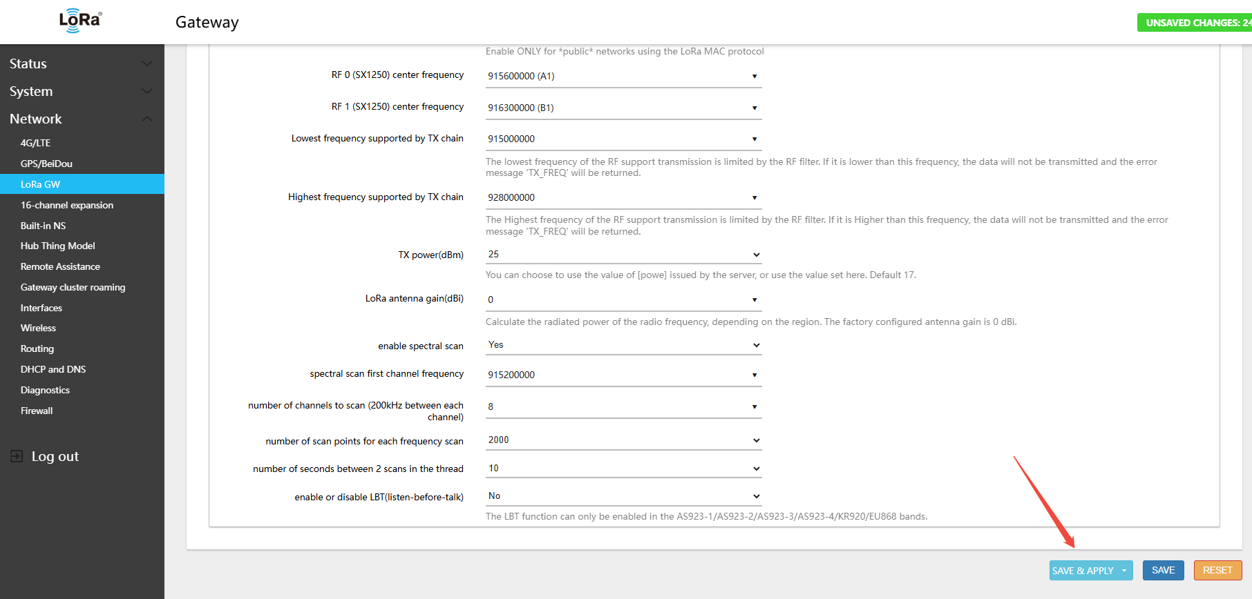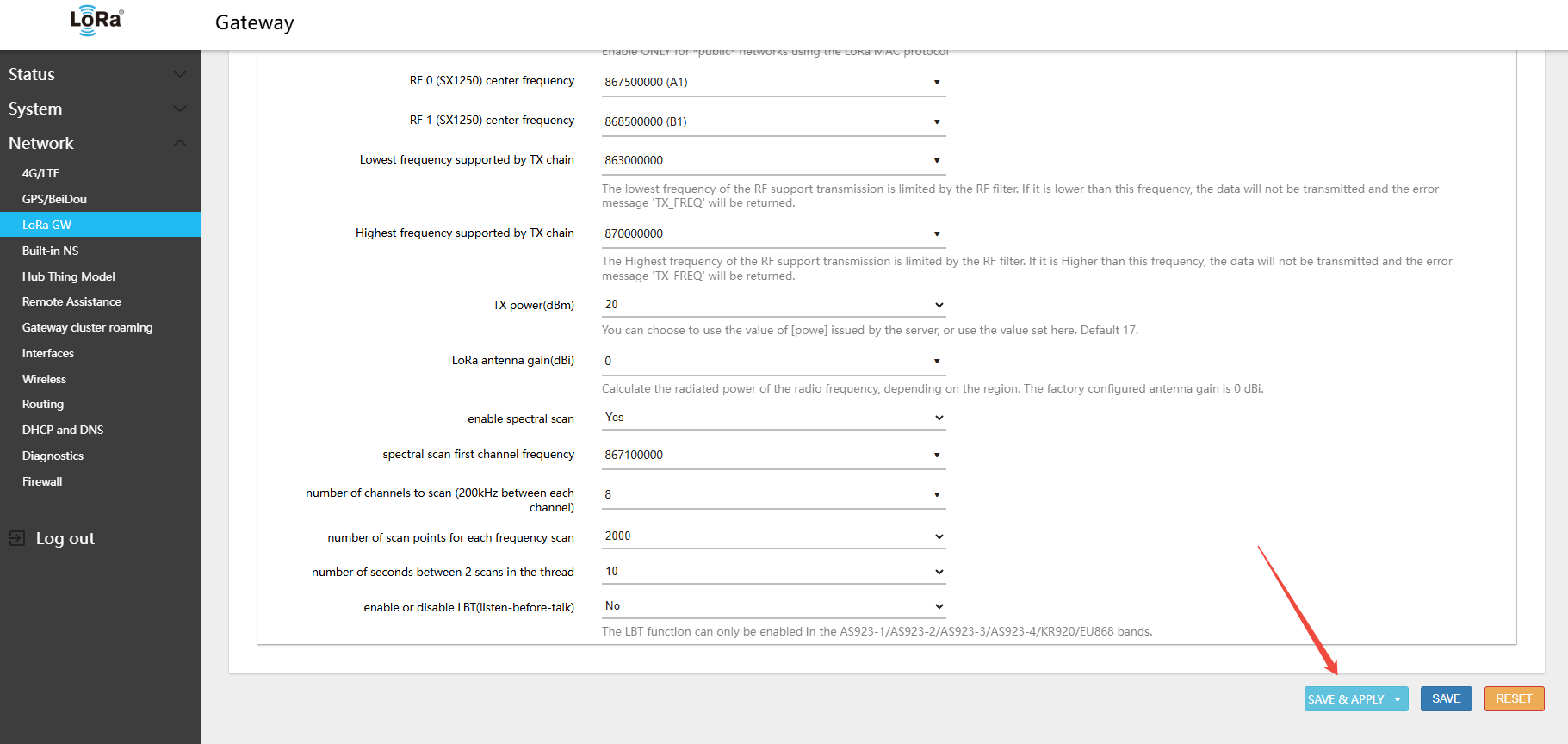 Warning: After every band switch, you must click Switch LoRaWAN frequency band first, then Save. If you skip this step, the RF frequency parameters will not be updated correctly.