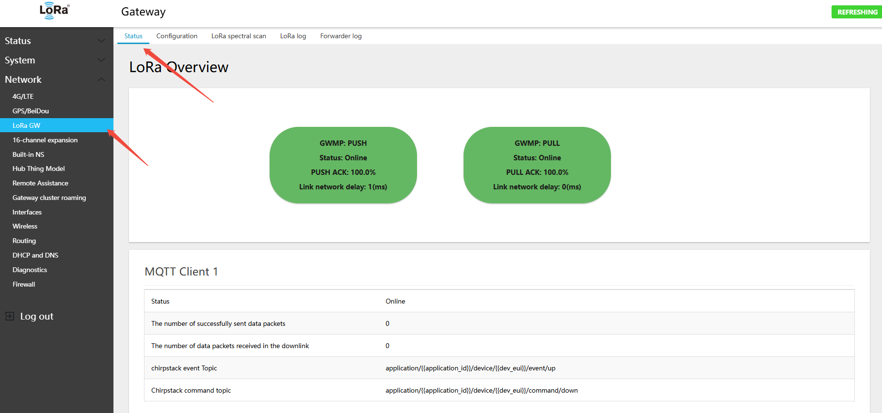 - Log in to the gateway Web interface and navigate to Network → LoRa GW(LoRa gateway) → Configuration(configuration)