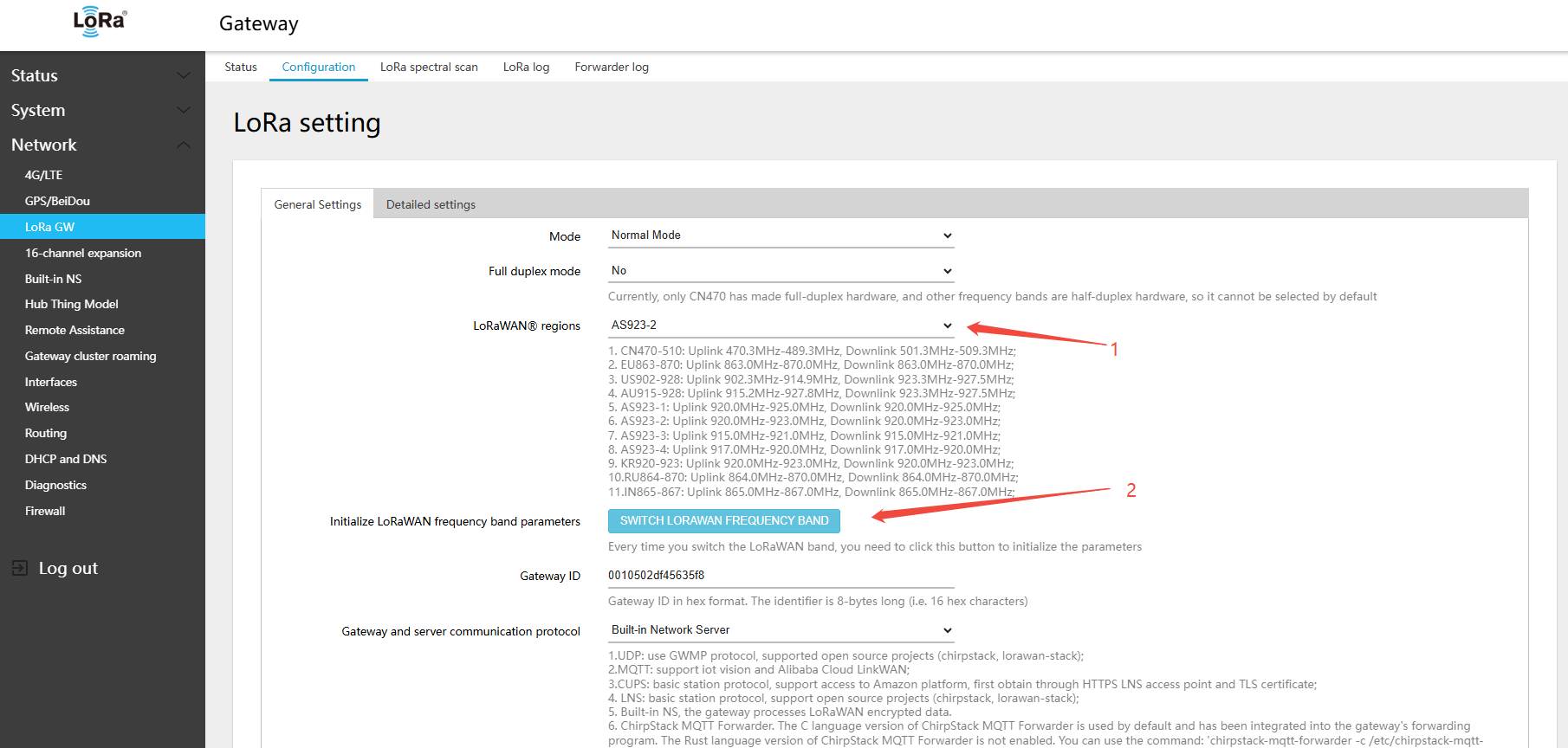 - In the menu Network → LoRa GW → Configuration, select LoRaWAN band: AS923-2
