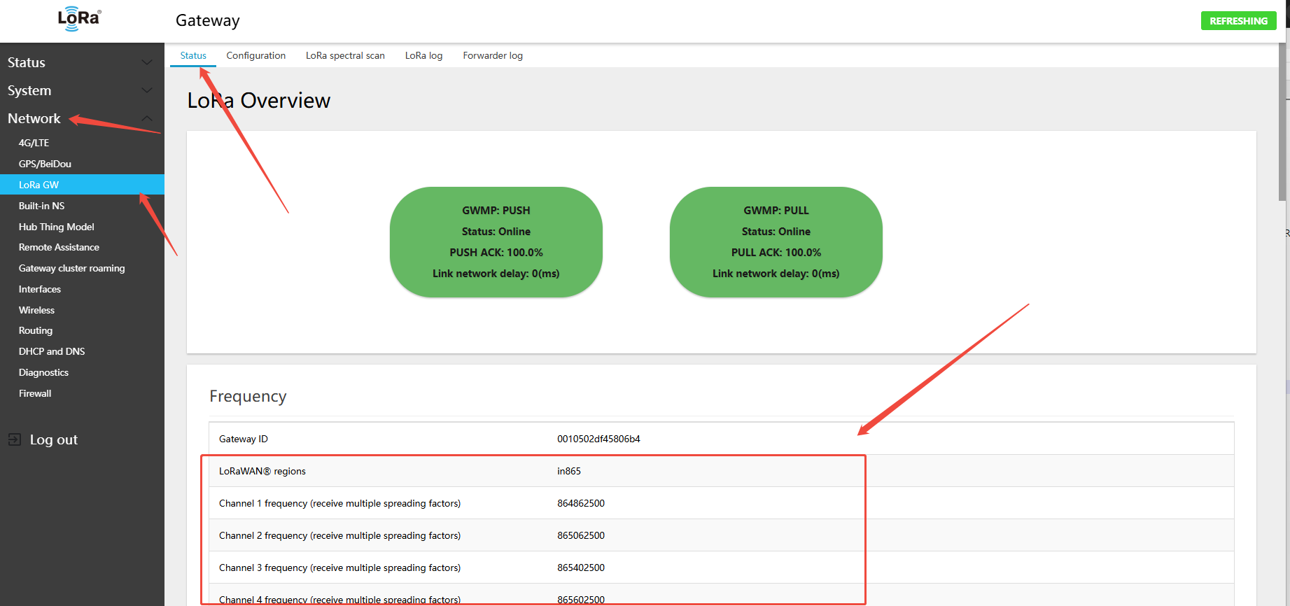In the menu Network → LoRa GW → Status, view the currently active channel configuration.