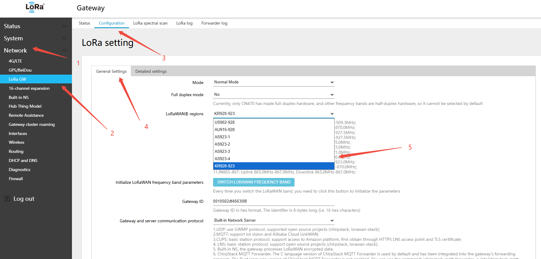 - In the menu Network → LoRa GW → Configuration, select LoRaWAN band: KR920-923