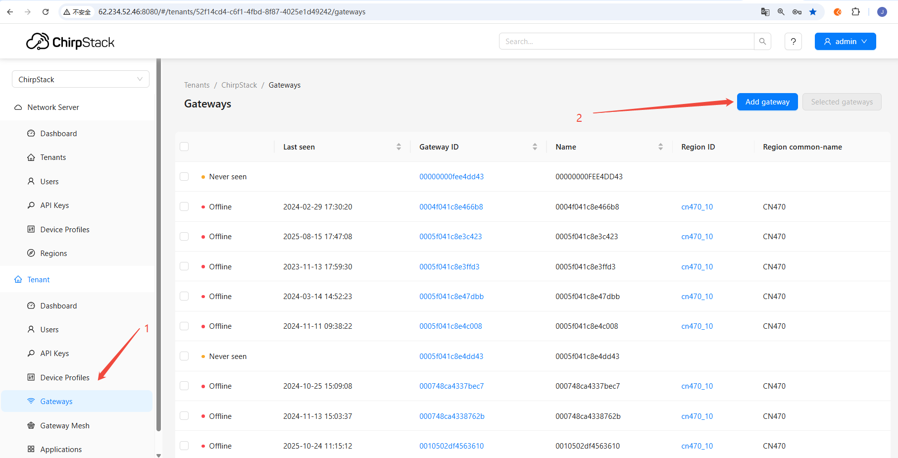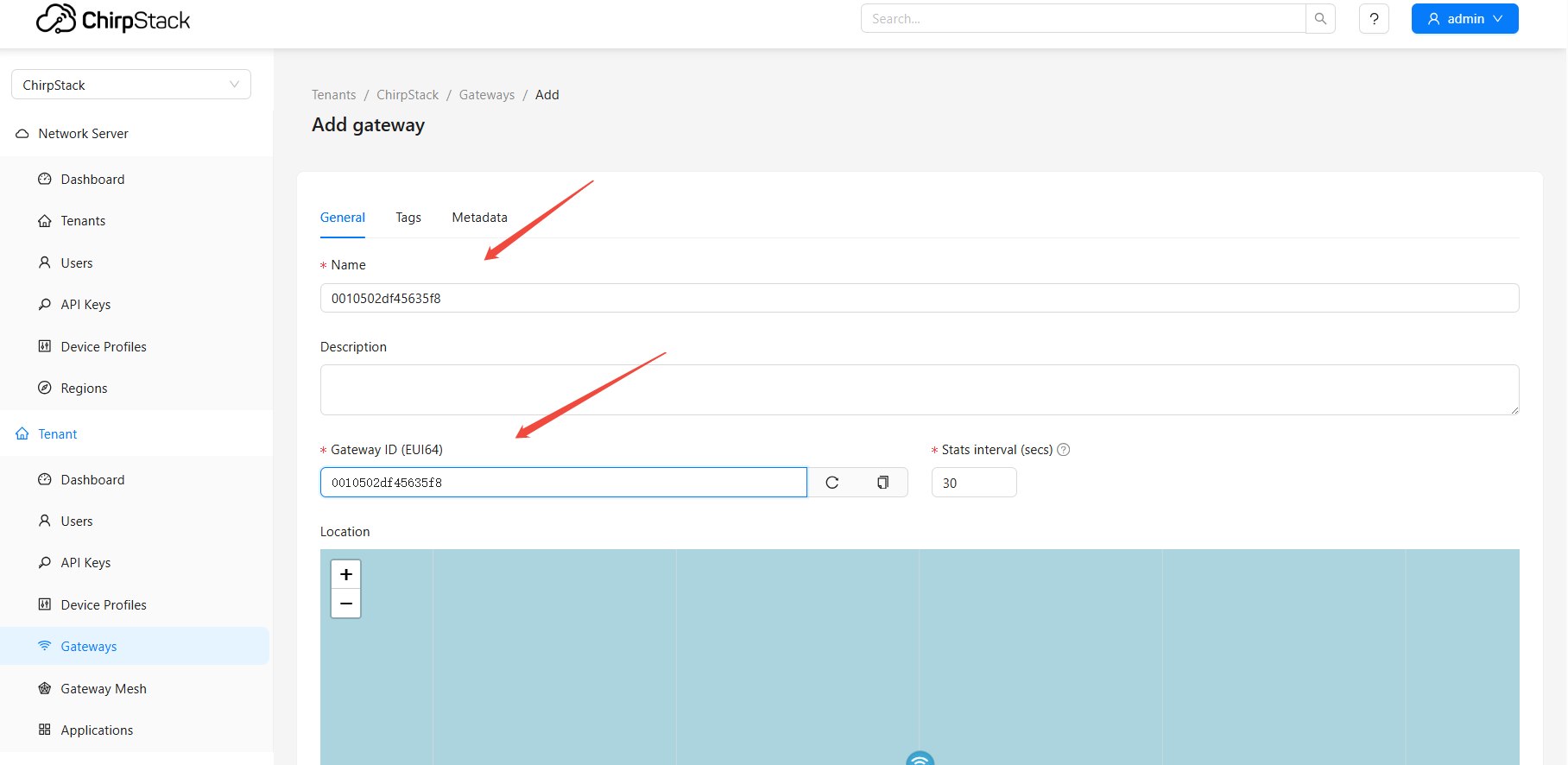 - Log in to the installed ChirpStack platform and add the gateway on the gateway management page