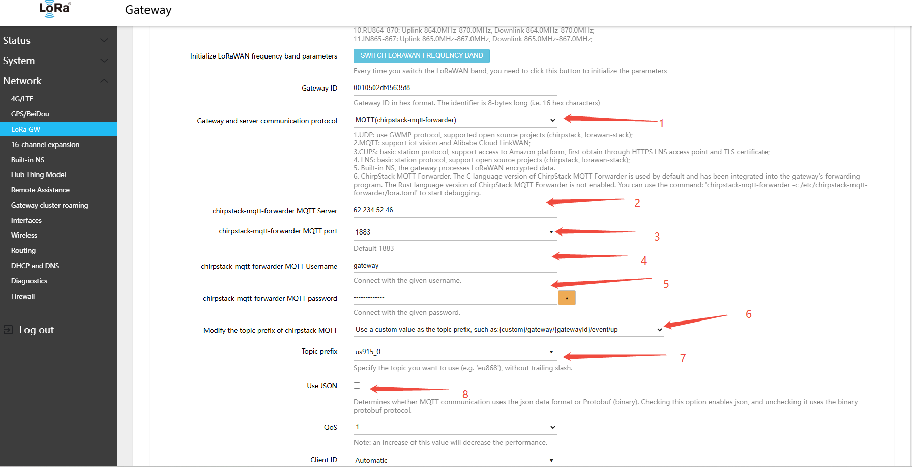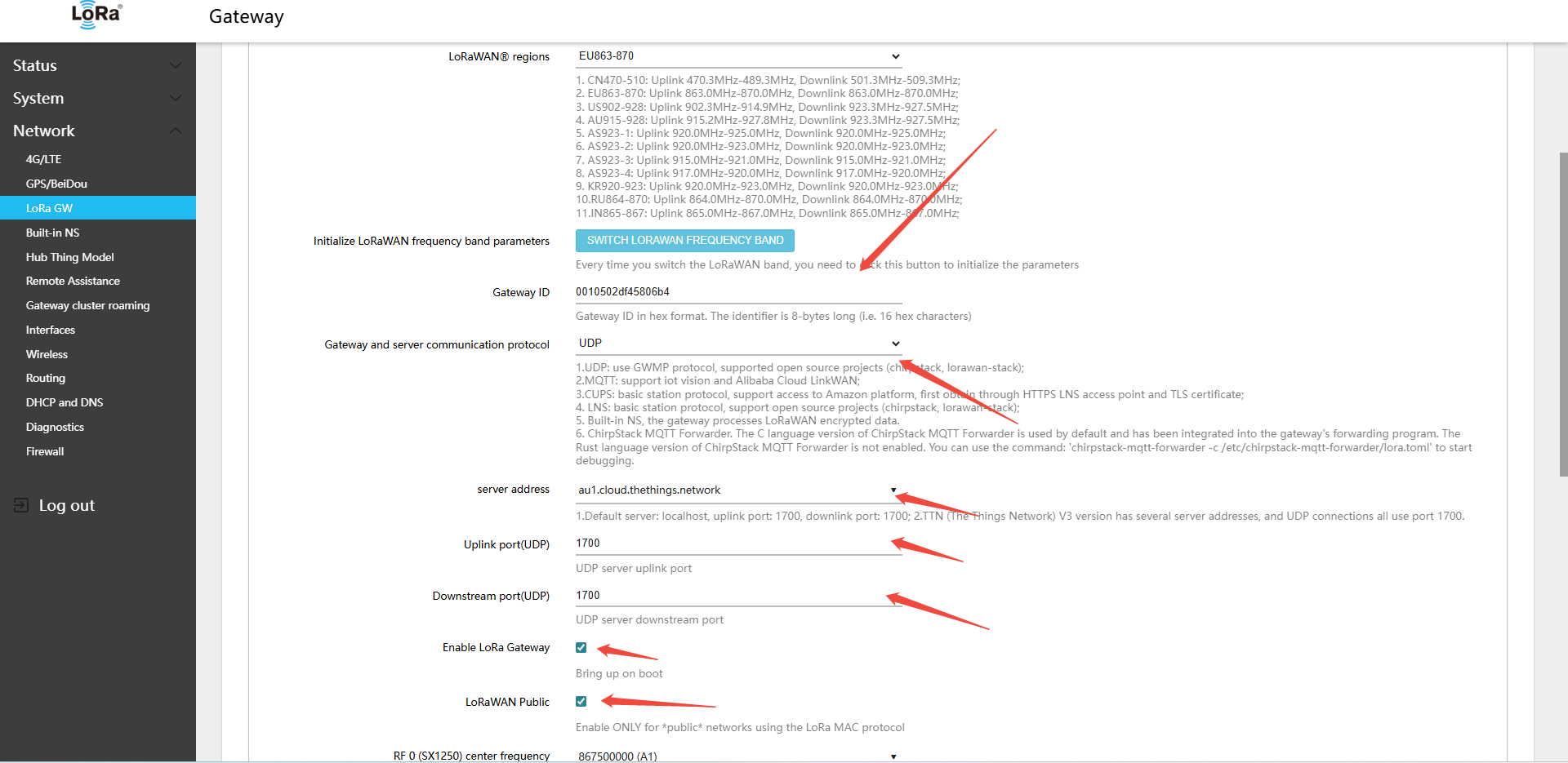 - Return to the gateway Web UI: Network → LoRa GW → Configuration, and configure the following settings: