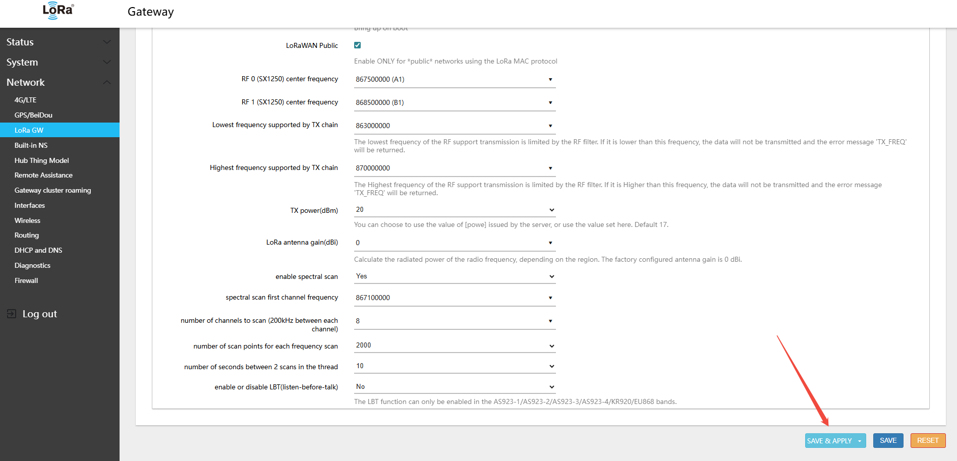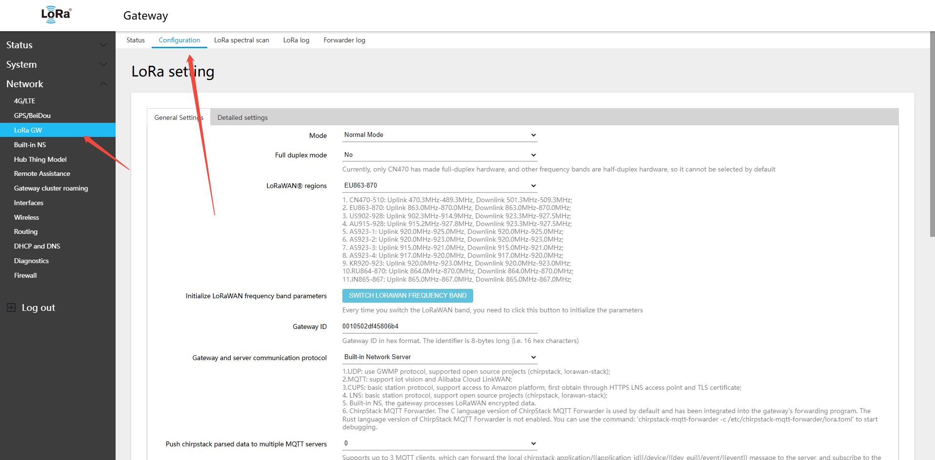 - Navigate to LoRa GW (LoRa gateway) → Configuration