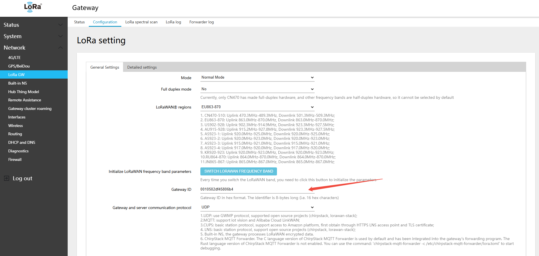 - In the gateway Web UI: Network → LoRa GW → Configuration, copy the Gateway ID: