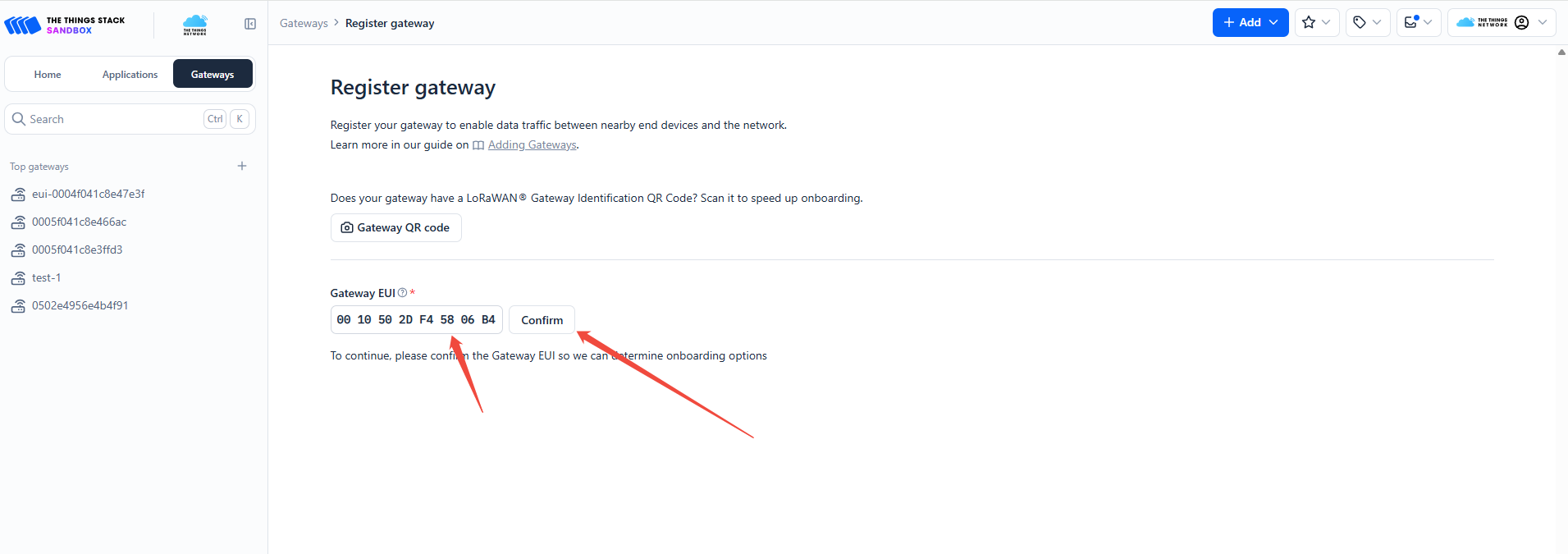 Paste the gateway ID on the TTN platform and click "Confirm"