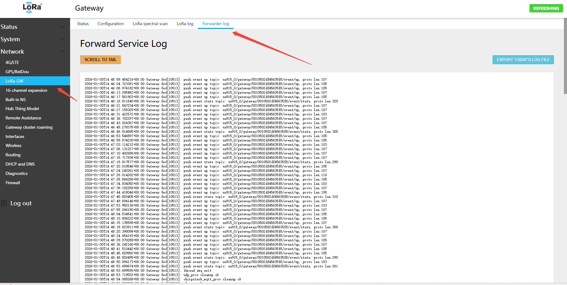 - The gateway will automatically fetch the LNS configuration from the CUPS server; view the corresponding communication log to verify