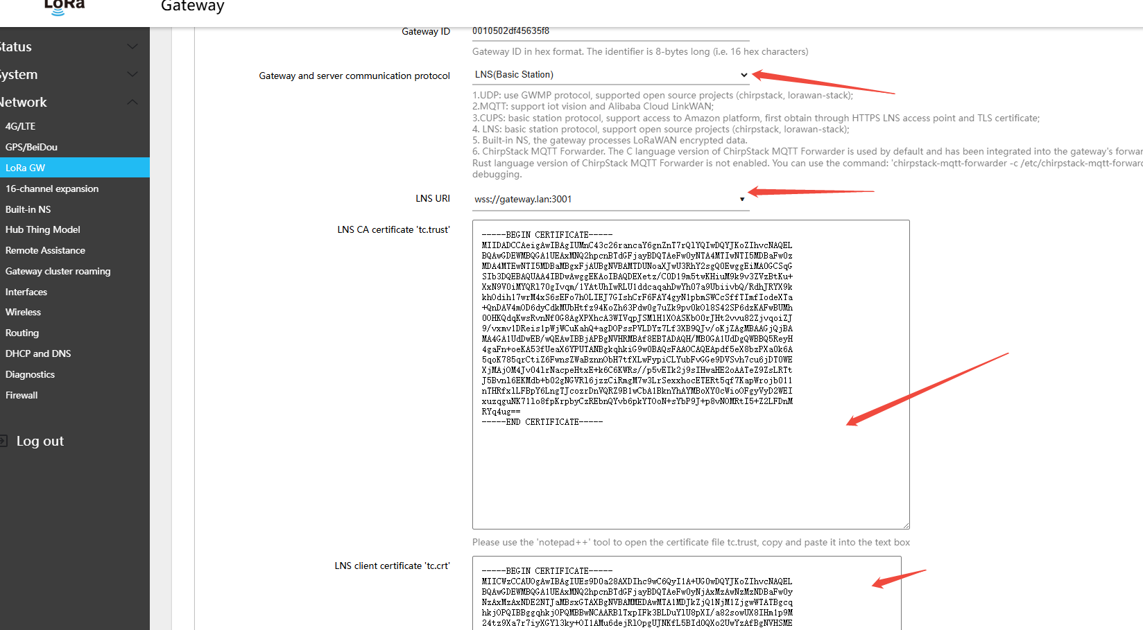 - LNS client private key "tc.key": Open the downloaded tc.key file, copy the certificate content and paste it into the text field