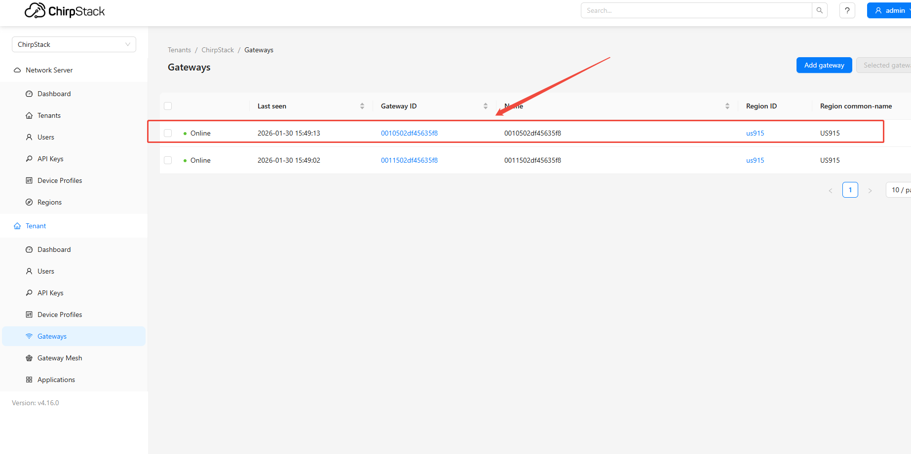 Gateway is now online, displayed as a US915-band gateway