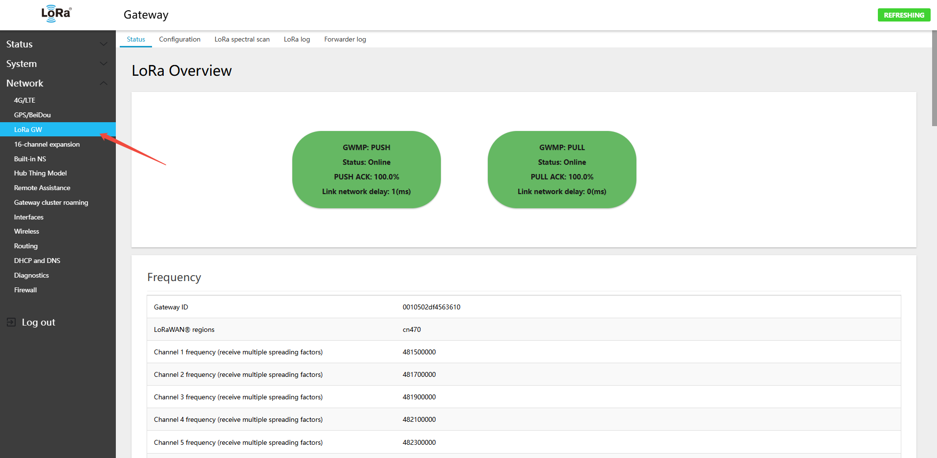 - On the gateway: Network → LoRa GW → Status — view the gateway-to-server connection status. (Because PUSH packets are sent every 30 s, click Save & Apply and wait 1 minute before viewing ): check online status