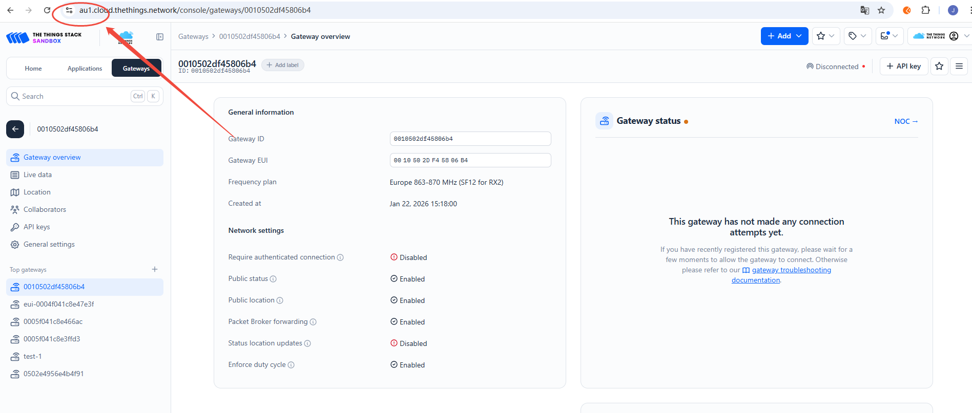 - Using the au1 region as an example: https://au1.cloud.thethings.network/console/gateways