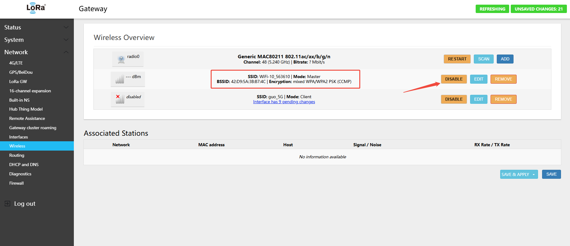此时STA连接路由器的接口已经配置好,需要把AP Master的接口禁用,点击 禁用 按钮