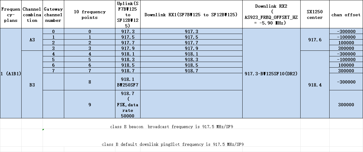 US902-928 gateway uplink/downlink channel table — factory default: A1B1