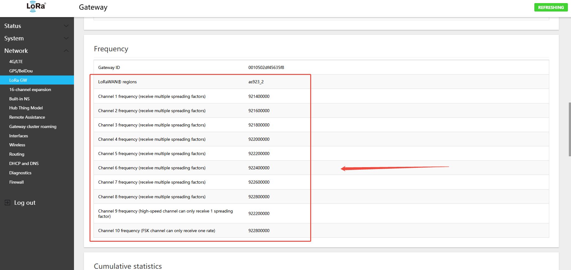 - In the menu Network → LoRa GW → Status, view the currently active band and channel configuration