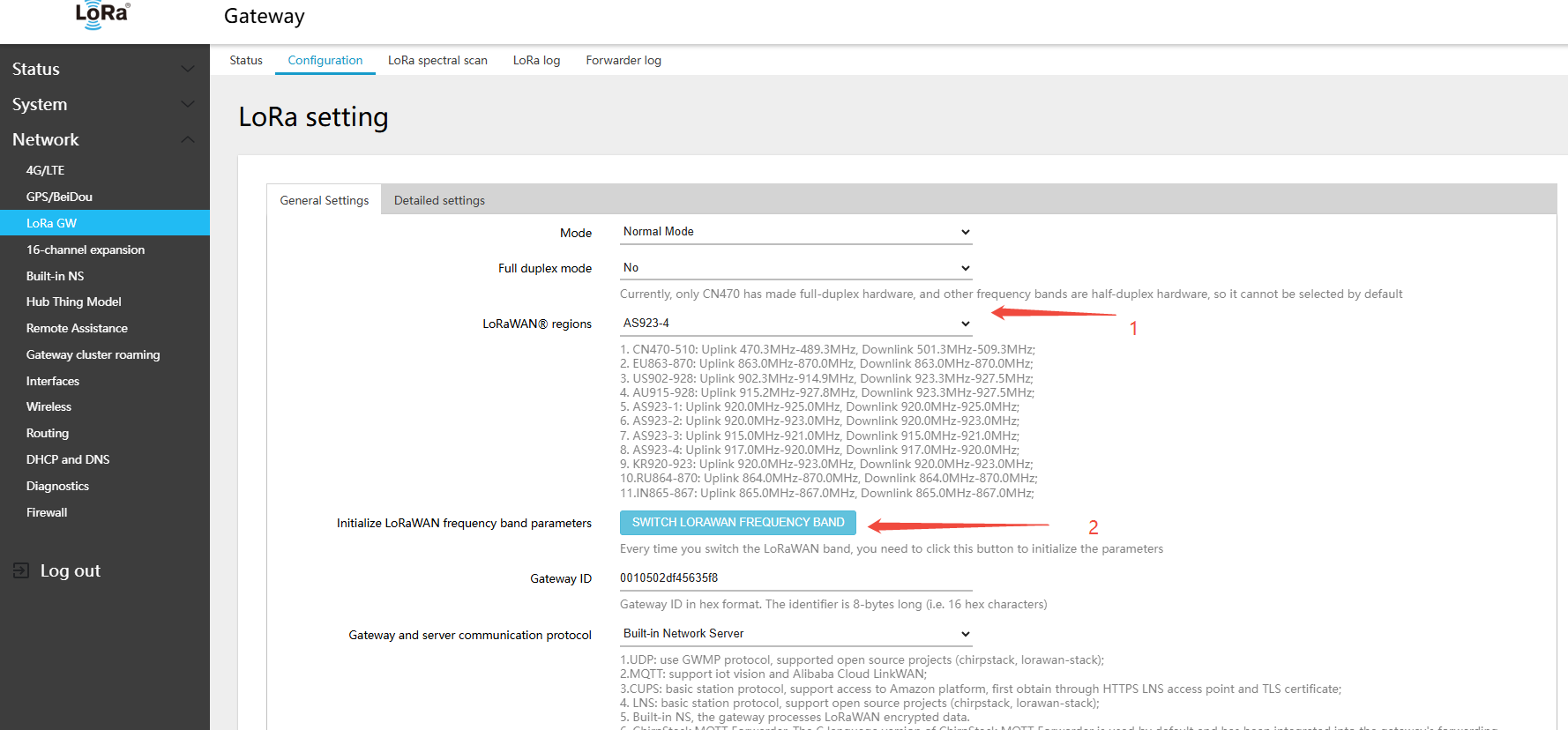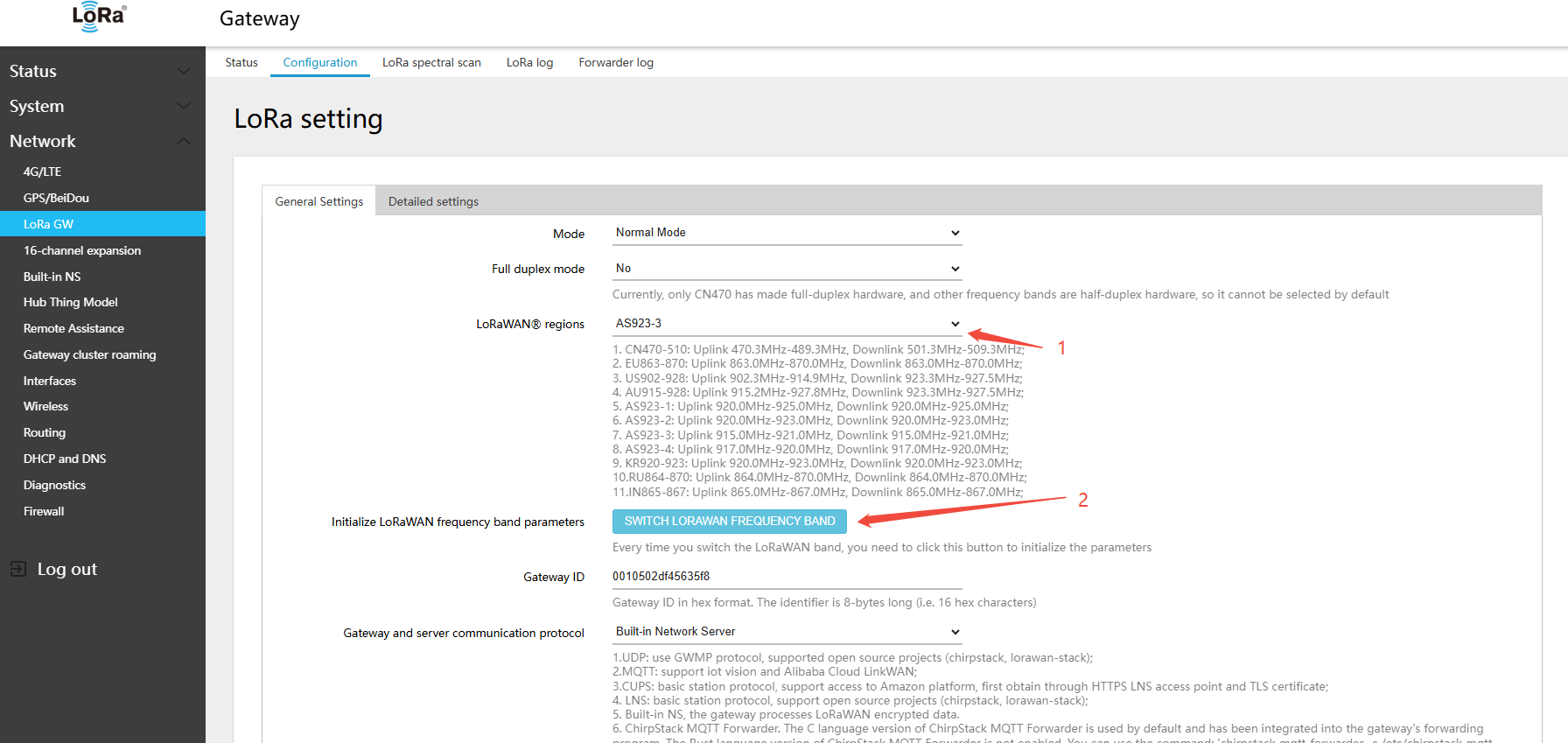 - In the menu Network → LoRa GW → Configuration, select LoRaWAN band: AS923-2