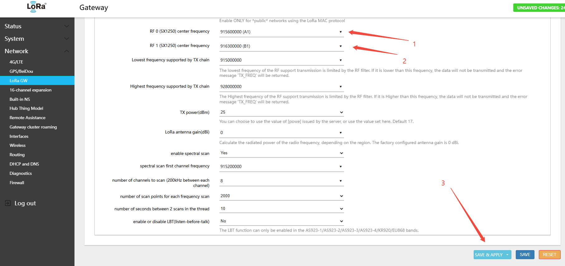 Warning: After every band switch, you must click Switch LoRaWAN frequency band first, then Save. If you skip this step, the RF frequency parameters will not be updated correctly.