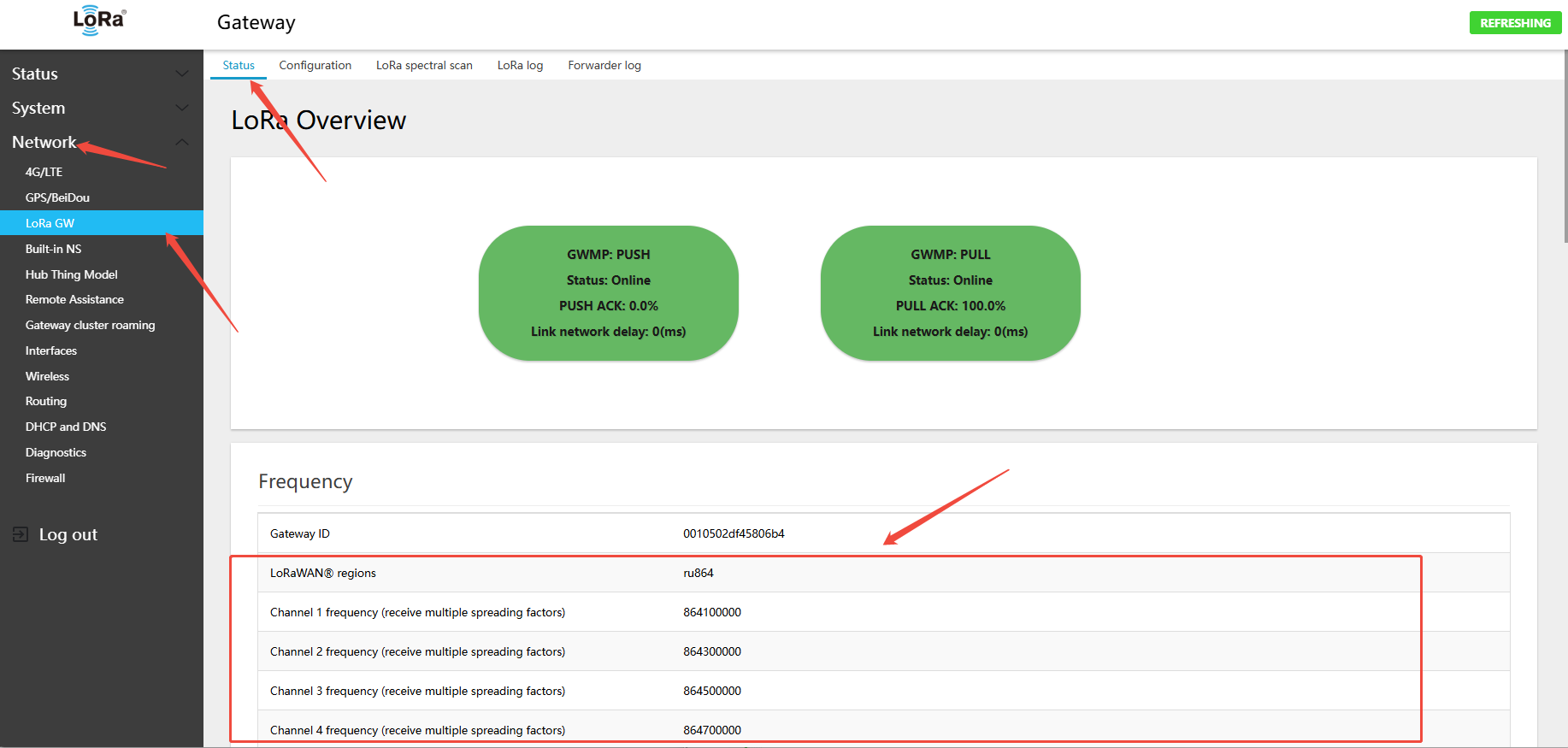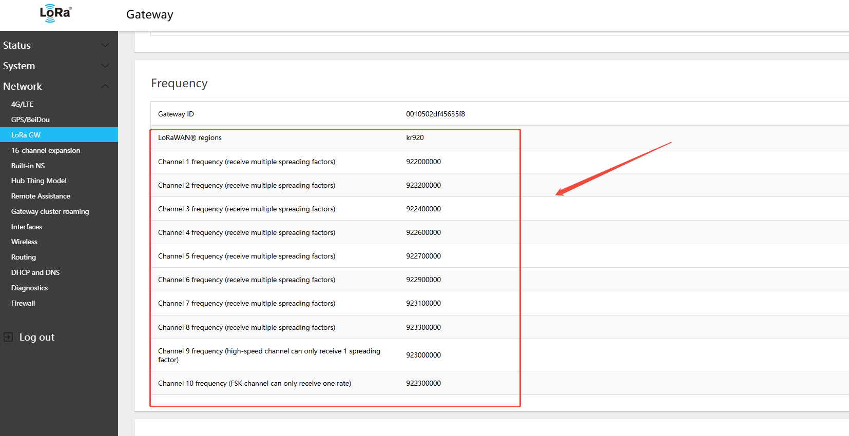 In the menu Network → LoRa GW → Status, view the currently active channel configuration.