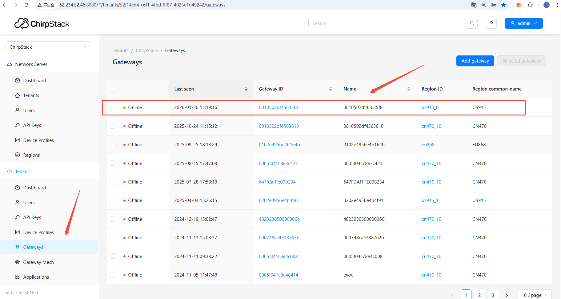 - On the ChirpStack platform page, view the gateway online status