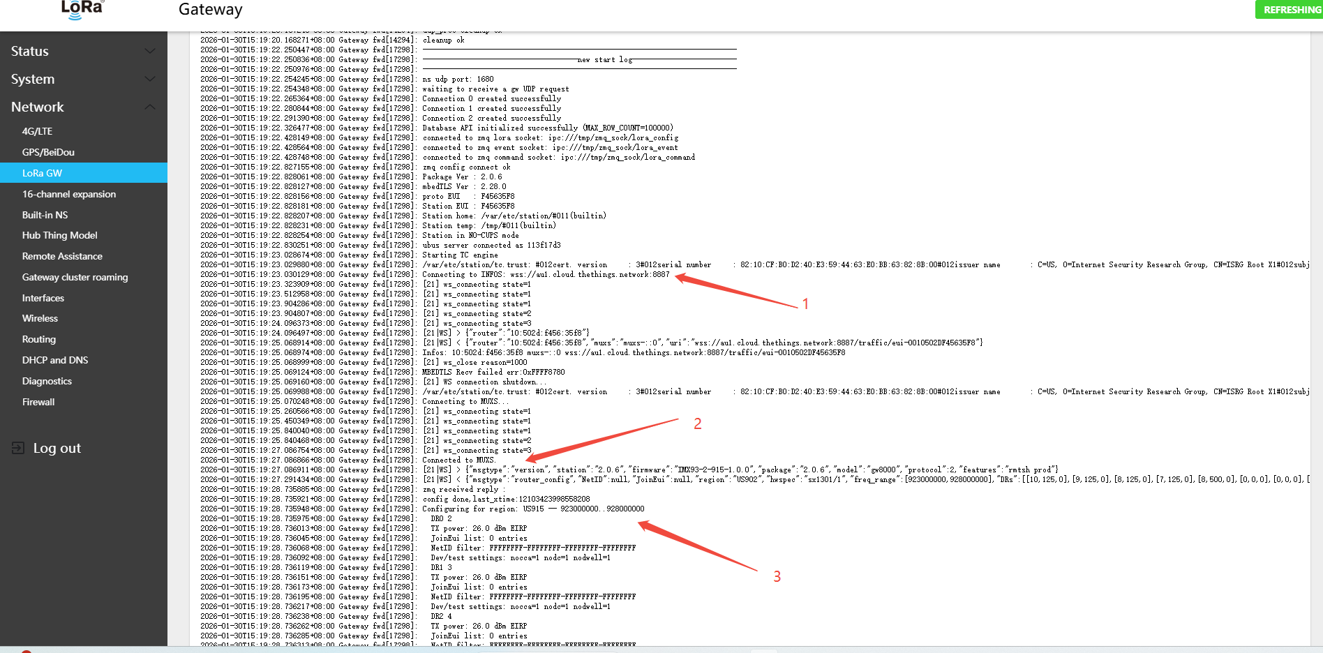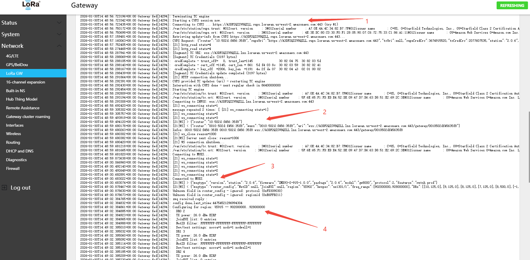 - The gateway will automatically fetch the LNS configuration from the CUPS server; view the corresponding communication log to verify
