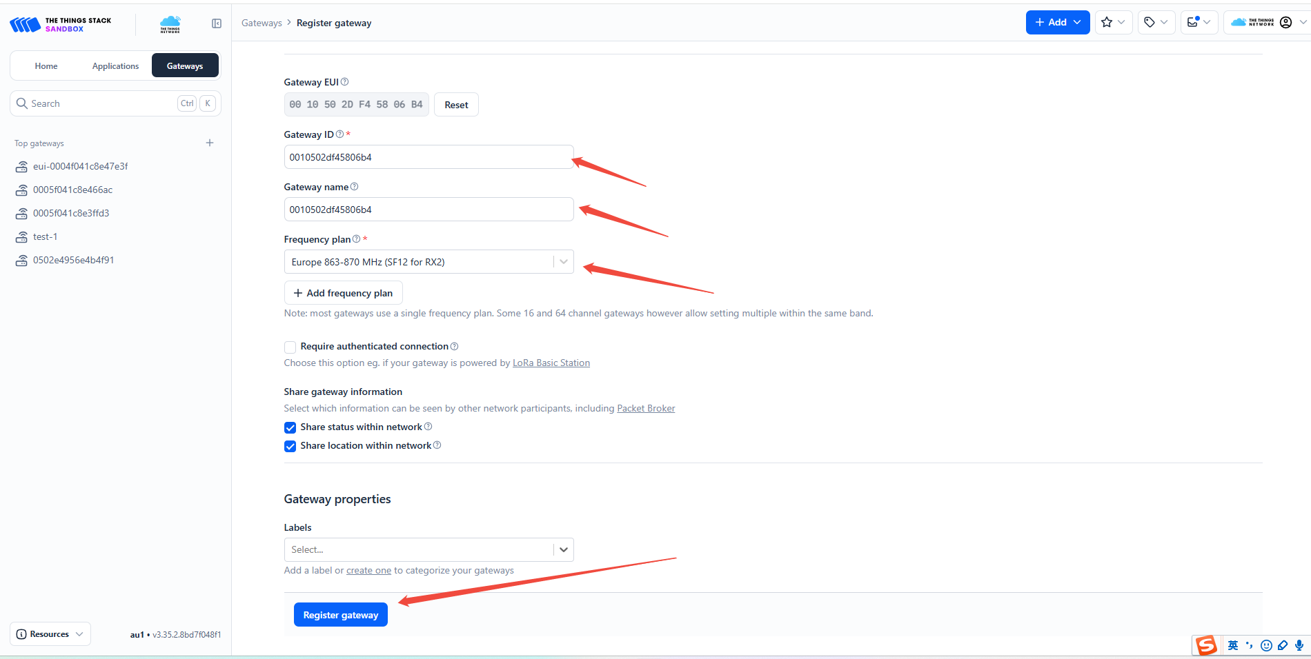 - Fill in Gateway ID (EUI64): 0010502df45635f8