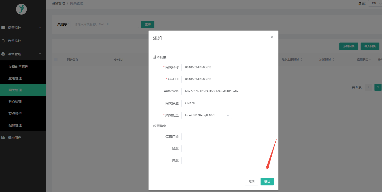 - Log in to the installed ChirpStack platform and add the gateway on the gateway management page