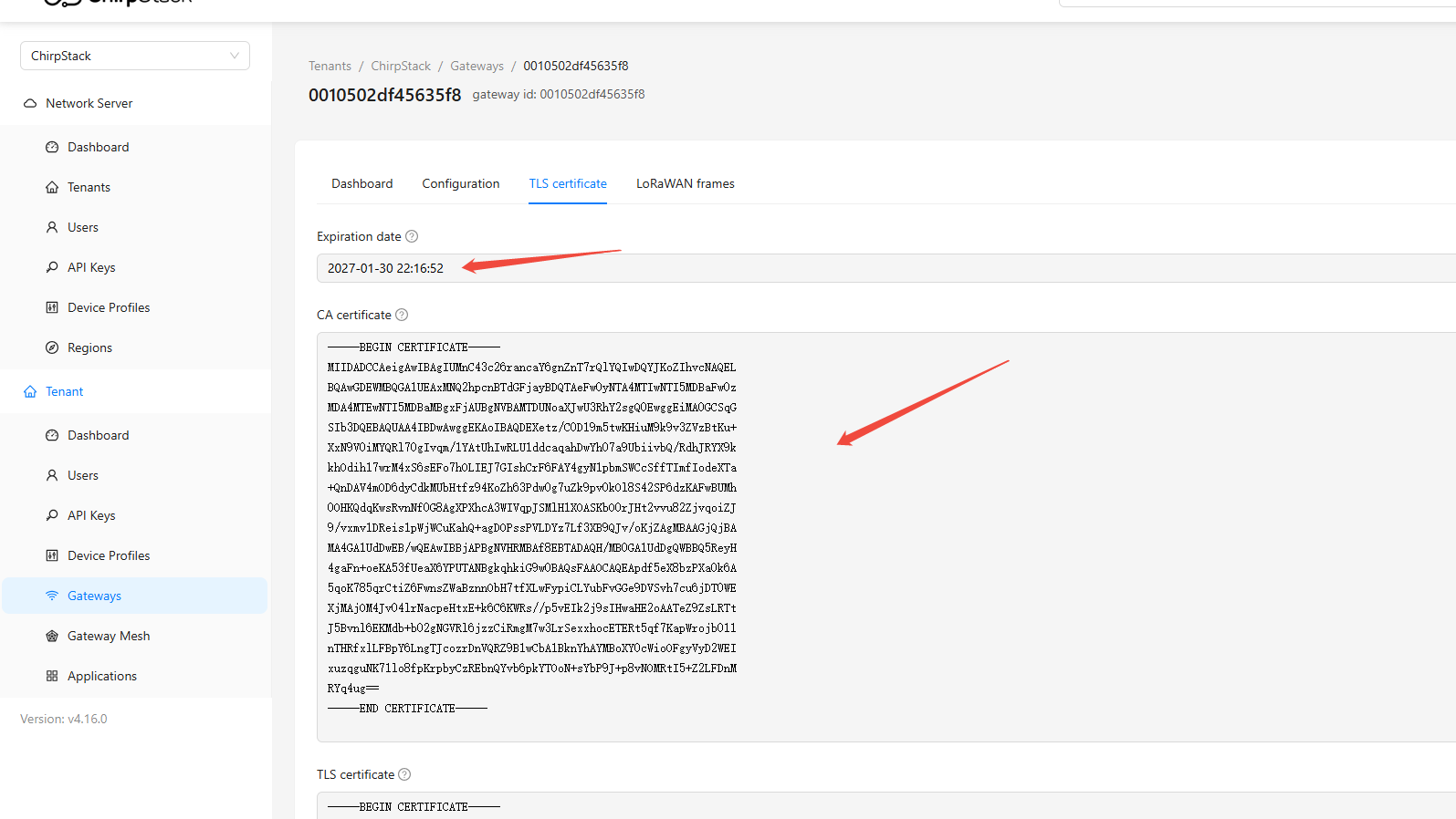 wss://gateway.lan:3001) - LNS CA certificate 'tc.trust': The CA certificate generated in step 1 on the ChirpStack page