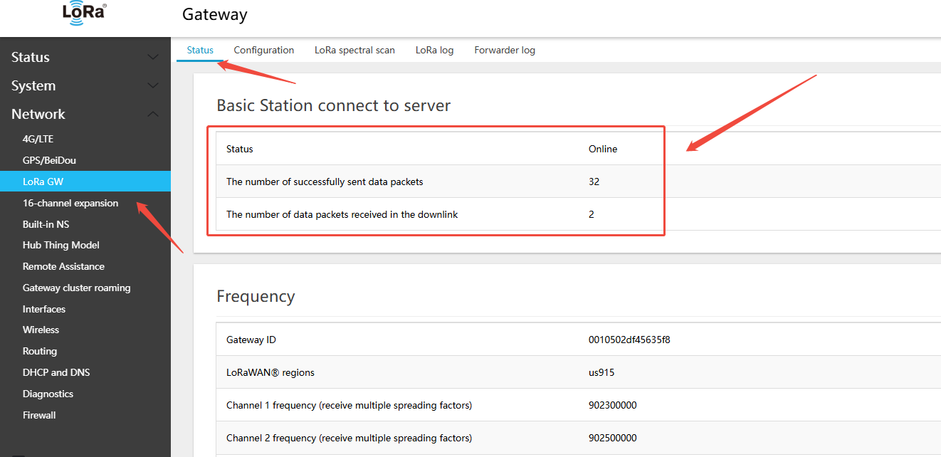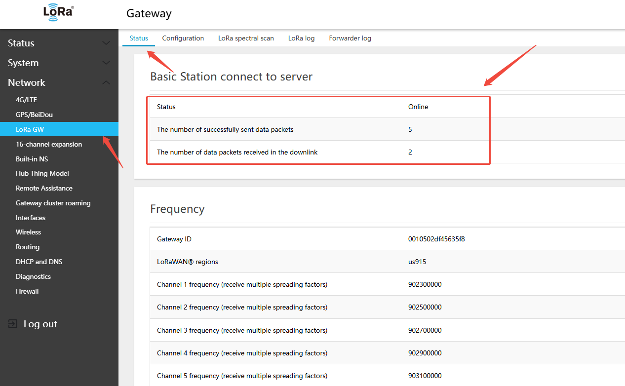 - On the gateway: Network → LoRa GW → Status — view the gateway-to-server connection status. (Because PUSH packets are sent every 30 s, click Save & Apply and wait 1 minute before viewing ): check online status