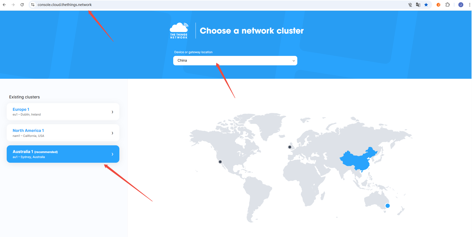 - Using the au1 region as an example: https://au1.cloud.thethings.network/console/gateways