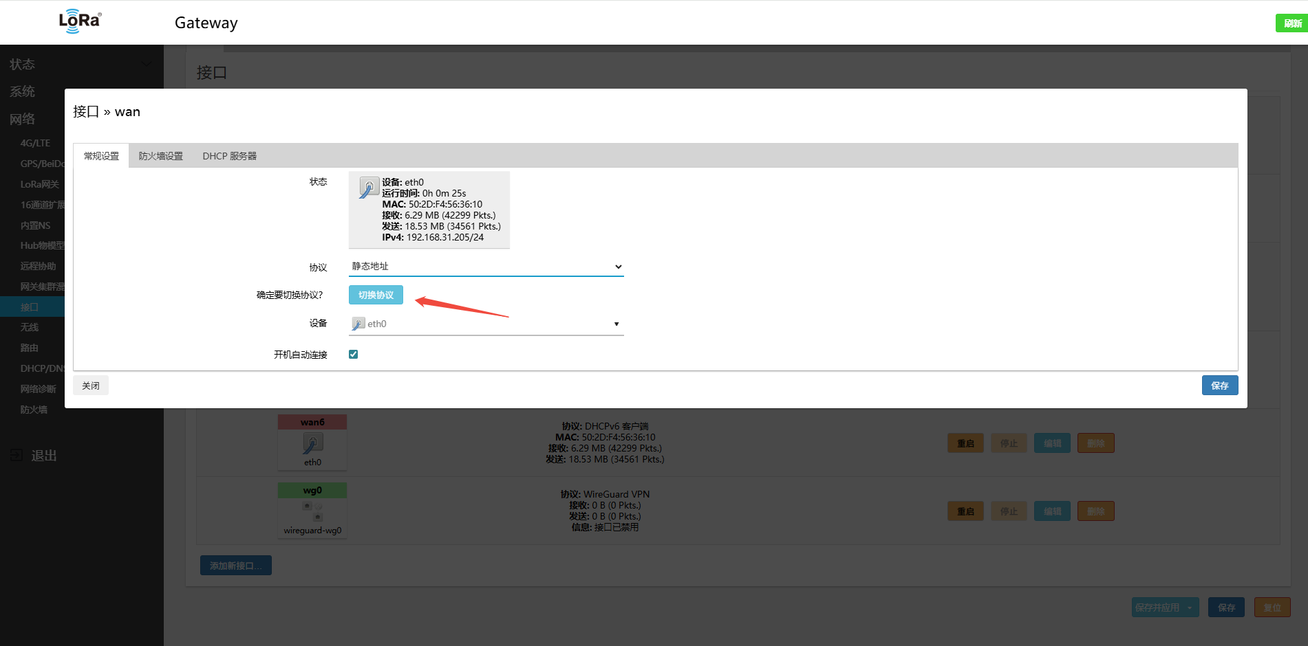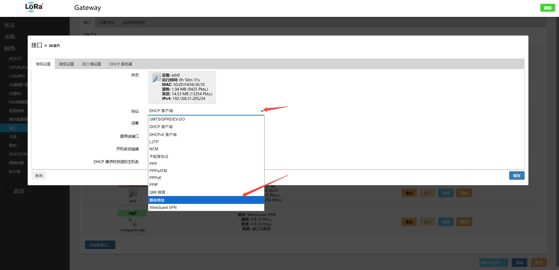 默认情况下,网关 WAN 口配置为 DHCP 自动获取 IP 地址。在某些场景下(如固定 IP 部署、端口映射等),需要配置静态 IP 地址。