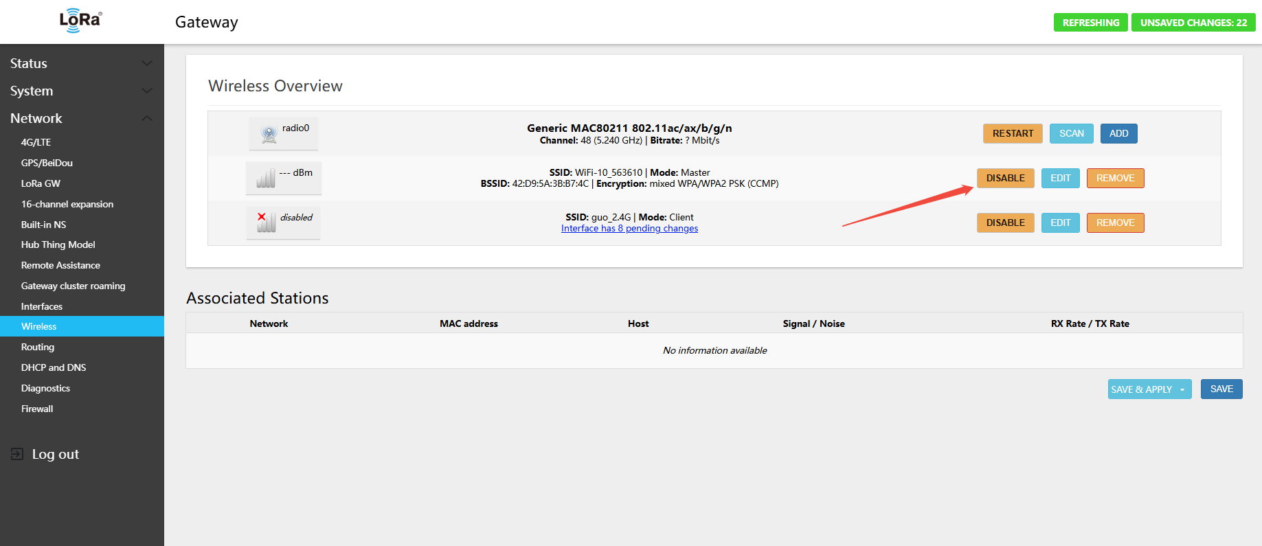 此时STA连接路由器的接口已经配置好,需要把AP Master的接口禁用,点击 禁用 按钮
