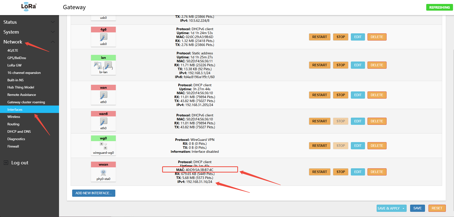 - 点击顶部菜单 Network(网络) → Interfaces(接口)